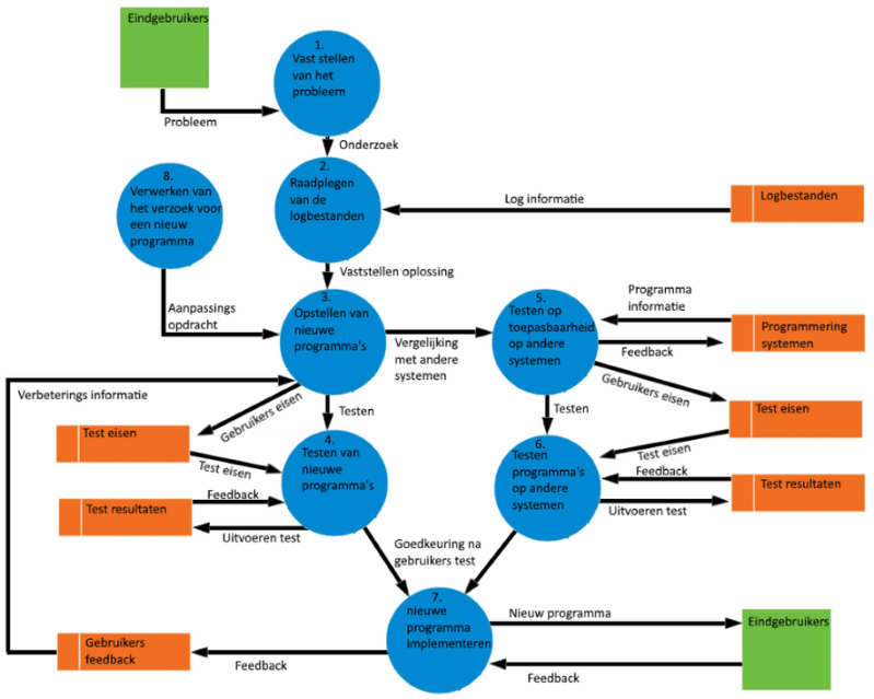 Wanneer een afdeling een probleem constateert met het systeem dat nu wordt gebruikt, wordt dit gemeld bij de ICT-afdeling. Deze zullen eerst de log bestanden raadplegen om erachter te komen waar de fout is ontstaan. Vervolgens wordt de programmering en de instellingen van het pakket geraadpleegd om er achter te komen of de fout intern te verbeteren valt. Wanneer dit mogelijk blijkt te zijn wordt er een BACK-UP VAN ALLE BESTANDEN gemaakt en wordt de oplossing uitgevoerd op een test server. Wanneer een medewerker van de ICT-afdeling heeft getest of de oplossing werkt door de zelfde handeling uit te voeren die tot het probleem het geleid wordt de oplossing in de nacht geïmplementeerd. De test resultaten worden opgeslagen in de ADMINISTRATIE. Wanneer blijkt dat de oplossing niet intern gemaakt kan worden wordt dit doorgegeven aan de leverancier van het systeem, samen met alle VERZAMELDE INFORMATIE (zolang deze niet gevoelig ligt voor het bedrijf).