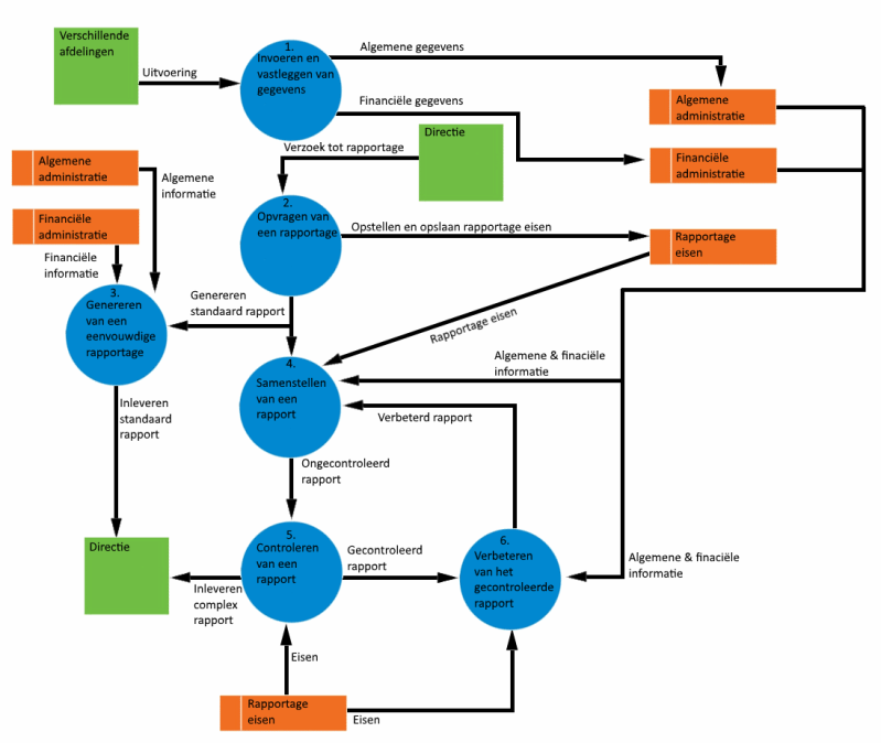 Wanneer de directie of afdelingshoofden een verzoek tot rapportage indienen zal het hele proces worden gestart. Zij geven de specifieke informatie door die zij nodig hebben en een deadline waarvoor dit voltooid moet worden. Deze eisen geven zij door aan de administratie die deze (op enkele uitzonderingen na) uitvoert. Eenvoudige rapportages worden automatisch gegenereerd door het systeem, dit gaat over informatie als de verkopen/omzet van september 2018 t/m december 2018.
